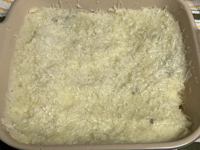 Il y a deux changements dans ma recette de la version landaise. J’ai oublié un ingrédient en préparant ce plat, la chapelure — je ne l’ai pas fait exprès, donc elle reste dans la recette, mais elle n’est dans aucune photo. Aussi, pour mieux faire fondre le fromage, j’ai fini par 5 minutes sous le gril.