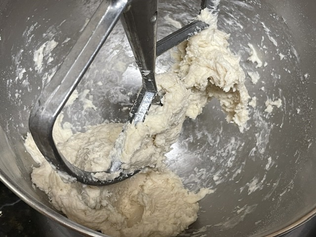 Battre à vitesse moyenne pendant quelques minutes. Ajouter progressivement l’eau, et battre jusqu’à ce que la pâte soit bien mélangée.