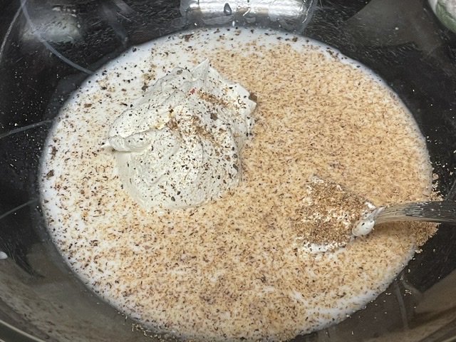 Saler, poivrer, et muscader le lait/crème. Ne me regardez pas comme ça — les instructions écrites de ma prof, une vraie Française, ont dit « muscader » !