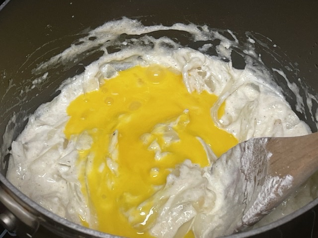 Hors du feu, ajouter les jaunes d’oeufs et le Comté à la béchamel en remuant fortement.