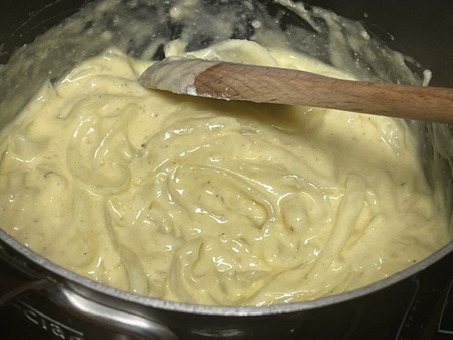 Verser le lait en filet en continuant de remuer pour obtenir une crème lisse.