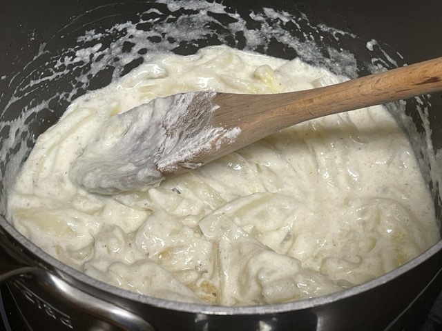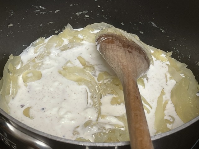 Ajouter le lait/crème et laisser mijoter pendant quelques minutes en remuant.