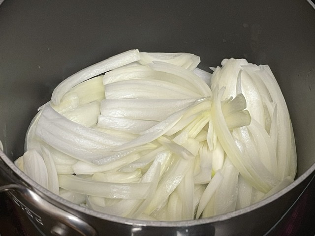 Faites revenir vos oignons émincés dans une poêle avec une noisette de beurre.