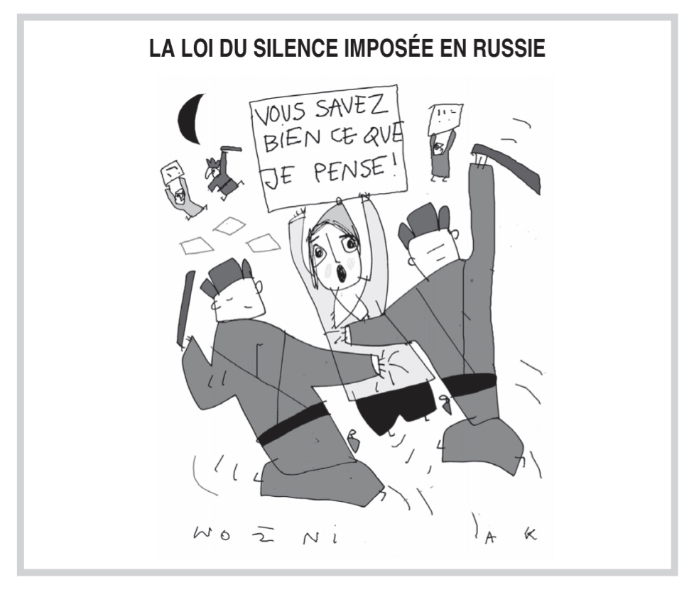 Bien sûr, la moitié du numéro traite de la Russie, comme d’habitude ces derniers deux mois. Dans ce cas, le dessin parle des arrestations de manifestants qui portent même juste des feuilles blanches :