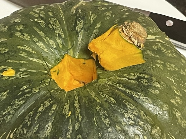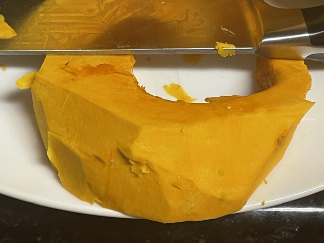 1. Mettre la kabocha dans le micro-ondes à haute puissance pendant 2-4 minutes. ATTENTION : il y a un risque que la kabocha se mettrai au feu ! Pour cette raison, REGARDEZ le micro-ondes.