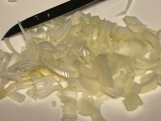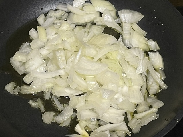 1. Émincer l’oignon et le faire revenir avec de l’huile d’olive. La recette originale dit oignon cru, alors cette étape est facultative.