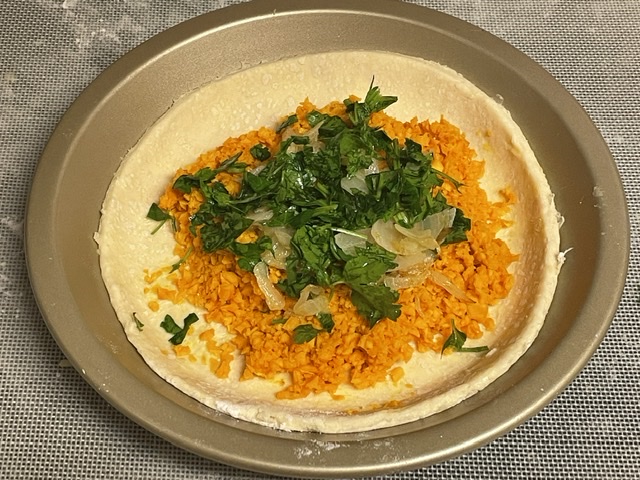 1. Étaler la courge crue en laissant une bordure de 1 cm tout autour. Parsemer le tout d’oignon émincé et de persil préalablement haché. Salez et poivrez. — À mon avis, la chair de kabocha restait trop ferme pour cuisiner de cette façon. Je l’ai donc mis dans un robot pour l’émincer.