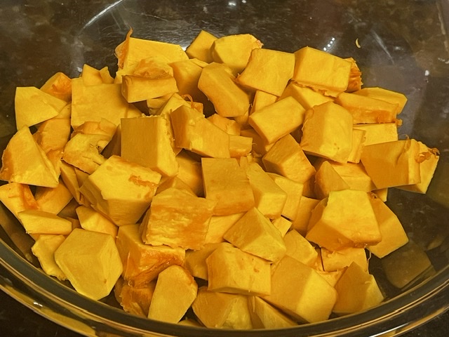 1. La veille : éplucher la courge, l’épépiner et la couper en petits dés.