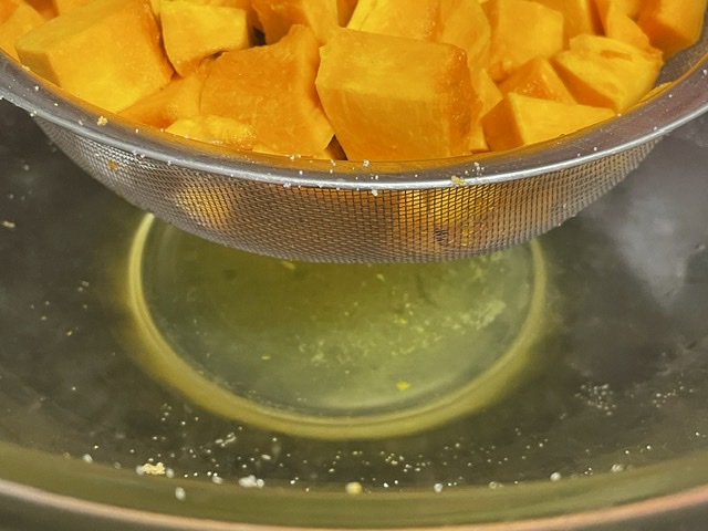 2. Saler le tout et égoutter la préparation toute la nuit dans le réfrigérateur. ATTENTION : cette étape va bien saler votre courge. Si vous rincez les dès, l’osmose gâchera vos efforts. J’ai mis les dès dans un chinois, et suspendu le chinois au-dessus d’un saladier. Vous pouvez voir exactement combien de liquide a été égoutté.