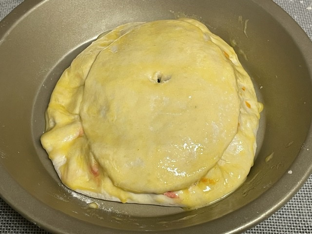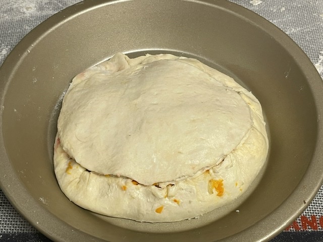 1. Relever la bordure de pâte vers l’intérieur et la recouvrir avec la deuxième pâte qui va faire guise de chapeau . Bien les souder entre elles.