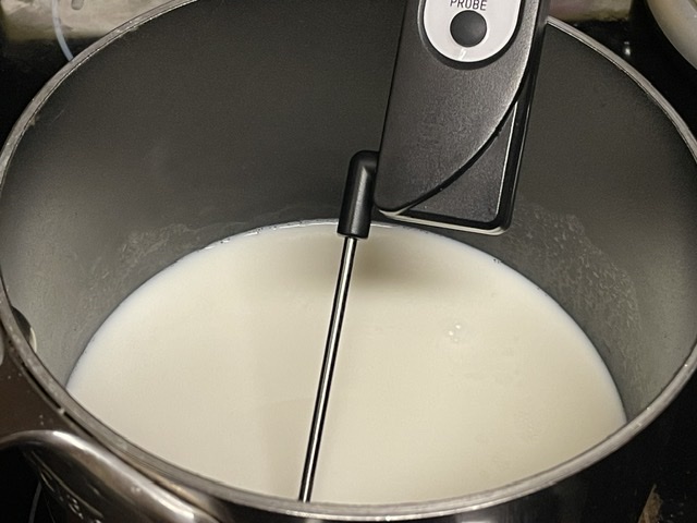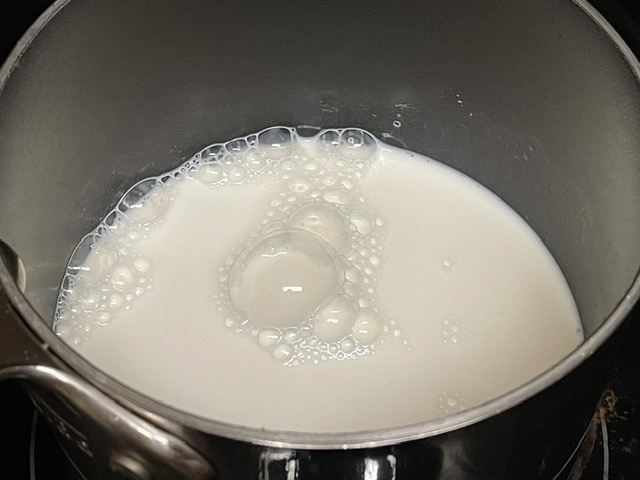 - Mettre le lait dans une casserole. Faire chauffer jusqu’à 85°C, puis continuer de laisser cuire pendant 5 minutes sans bouillir. Baisser le feu si c’est nécessaire.