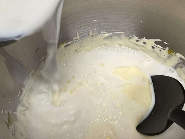 - Comme pour la crème pâtissière, verser un peu du lait dans les jaunes d’œuf et remuer.