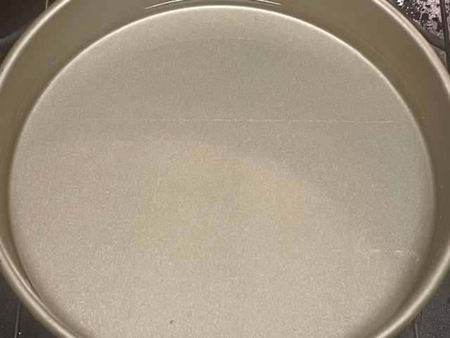 - Couvrir d’un torchon et laisser lever pendant 6h dans un endroit tiède. — Pour faire un endroit bien tiède, j’ai chauffé de l’eau, puis l’ai mise dans un moule à gâteau au fond de mon four. On utilise la même technique pour les baguettes, mais j’ai arrêté de chauffer l’eau dès que j’ai vu la première vapeur.