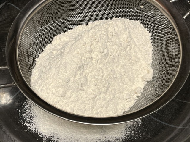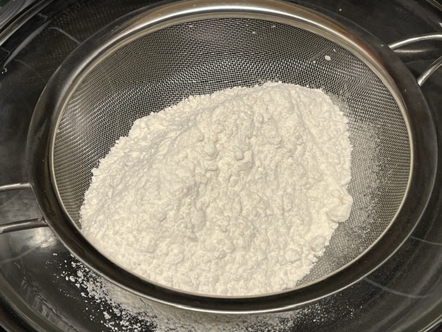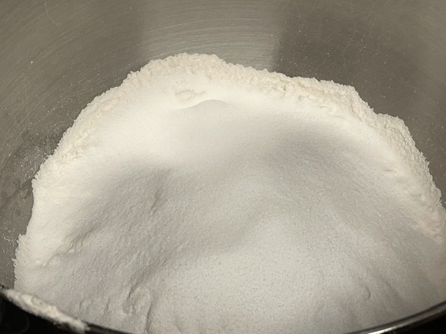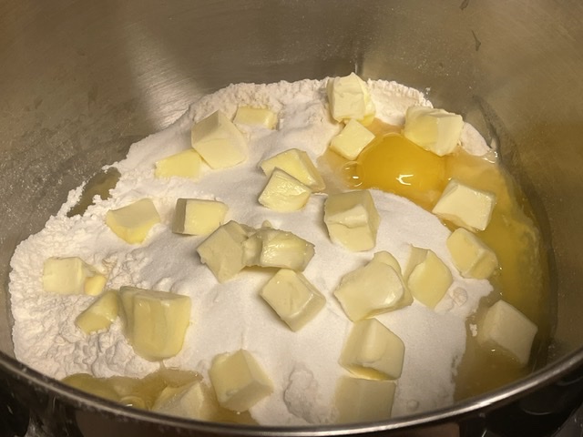 - Dans un saladier, ou le bol d’un robot avec le crochet, verser la farine, le sel, le sucre, les œufs, et le beurre. J’ai tamisé ma farine deux fois car j’ai raté le premier essai avec de trop gros grumeaux.