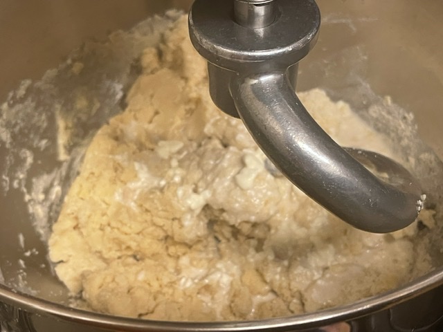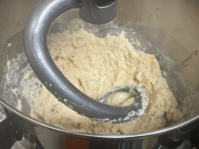 - Pétrir la pâte en ajoutant petit à petit le reste du lait. — J’ai fait ça avec le crochet de mon robot à petite vitesse. La photo à gauche a été prise avant le lait ; à droite, après.