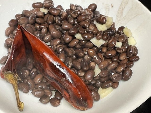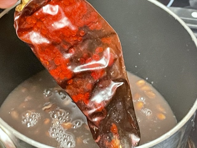 Pour les frijoles negros, il faut trouver un genre de piment. Chile d’arbol en preference, mais juste un piment asséché en tout cas. Les vrais mexicains feraient une purée avec le piment et l’ail pour faire quelque chose d’ÉPICÉ, mais on va jute les faire mijoter avec les haricots noirs pour donner un goût. C’est bien moins épicé. Consultez cette recette de Oaxaca grâce à Slow Plates pour une version encore plus authentique.