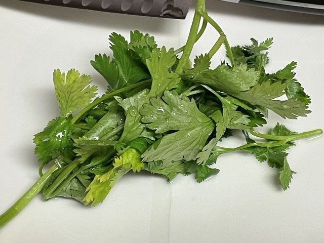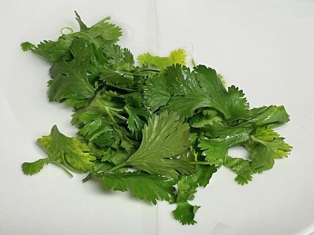 - Rincer les feuilles de coriandre. Enlever les tiges. Faire une chiffonnade avec les feuilles.