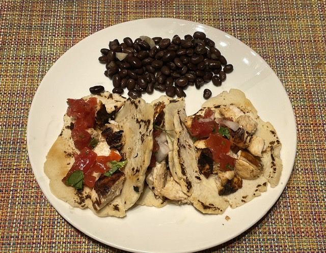 On passe enfin au montage. C’est très simple. Poser des tortillas sur une assiette. Couper le poulet en petits dès. Mettre du poulet sur chaque tortilla, puis du pico de gallo. Servir avec des frijoles negros. Rien de plus simple !