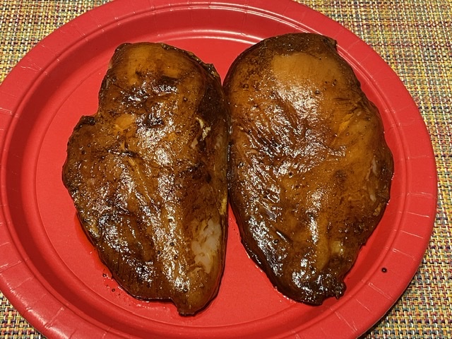 Pendant que les haricots sont en train de mijoter, faire le barbecue avec votre poulet. Moi, je l’ai laissè sur le feu 15 minutes le côté (n’oubliez pas que mon thermomètre est en degrés Fahrenheit). Si on sort le poulet du frigo en avance, moins de temps est nécessaire. Mon poulet était assez cuit. Voilà des photos :