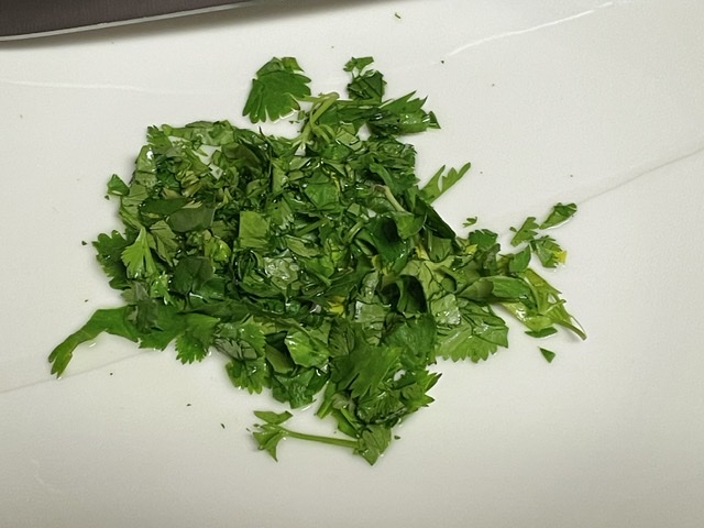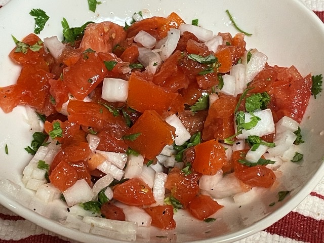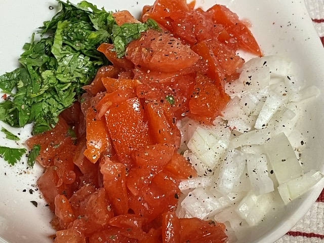 On passe maintenant au pico de gallo. Utilisez des feuilles de coriandre fraîche. Au fait, aux États-Unis, on suit le français en disant « coriander » pour les graines, mais on suit l’espagnol en disant « cilantro » pour les feuilles. C’est la même chose. On veut le cilantro, les feuilles. On peut le faire avec des piments jalapeno émincés, mais ce sont difficiles à trouver en France et facultatifs en tout cas. On peut consulter un site comme Natasha’s Kitchen pour des idées pour le pico de gallo, mais c’est l’un des trucs les plus basiques de la cuisine mexicaine.