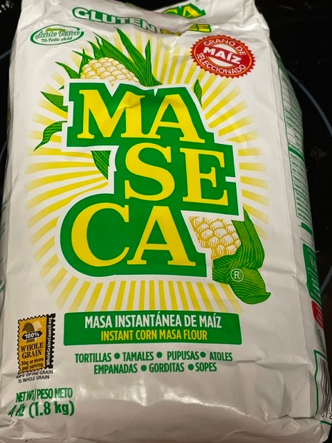 On passe aux tortillas. Pour cette étape on a besoin de « maseca », dit aussi « masa harina ». C’est de la farine de maïs, mais pas seulement ça. Il y a un procès appelé « nixtamalisation » qui traite la farine avec de l’hydroxyde de calcium. C’est possible de la trouver en ligne en France, comme ici, mais les stocks sont en rupture partout pendant que j’écris. Attendez un peu ; ça vaut la peine.