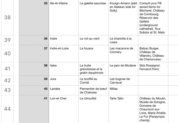 On peut voir que mes recettes sont là, mais aussi des renseignements sur chaque département. C’est pas le cas qu’ils ont tous apparu dans mes articles. Mais quand je lis quelque chose sur n’importe où, je l’ajoute au fichier au cas où j’aimerais la citer. Vous ne pouvez pas la voir, mais il y a une dernière colonne pour me rappeler si j’ai des connaissances qui y habitent.