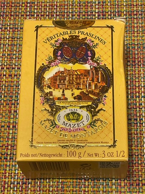 Quoi manger dans le Loiret ? En produits locaux, on y trouve l’andouille de Jargeau — à ne pas confondre avec l’andouillette de Jargeau — ne me regardez pas comme ça, c’est en haut de l’article de Wikipédia ! — une saucisse pleine de tripes, le fromage Olivet (souvent couvert avec du foin ou cendré), le vinaigre d’Orléans, et mon préféré, les praslines de Montargis — voilà la boîte que j’ai reçu de mon ami P. (et le tapis qui vous garantit que cette photo est bien la mienne ) :