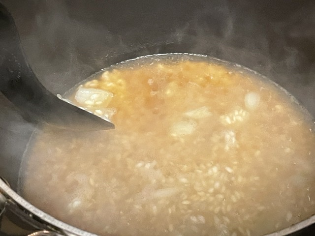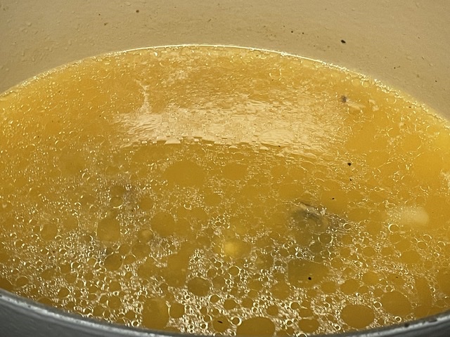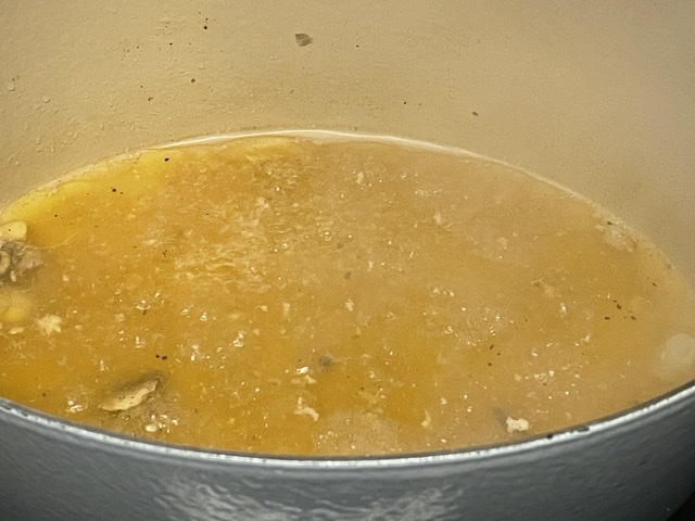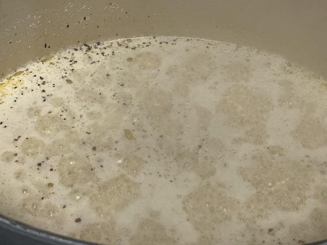 Préparer le bouillon. Mon erreur était de faire confiance à la suggestion d’utiliser soit bœuf soit poulet. Il faut utiliser du bouillon de poulet. Le bouillon de bœuf donnera une couleur trop marron au riz. Une fois le bouillon bouille, réduire le feu et couvrir jusqu’à la 4e étape.