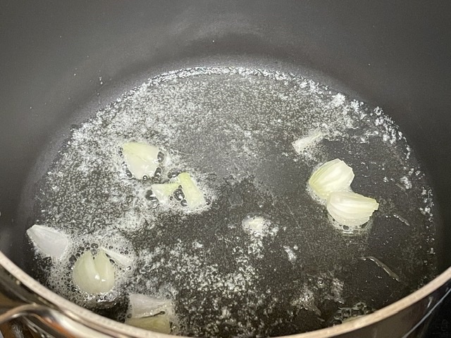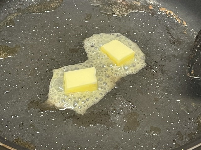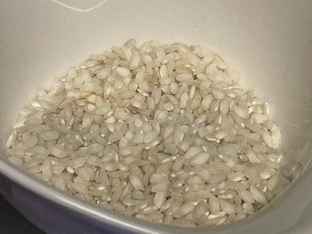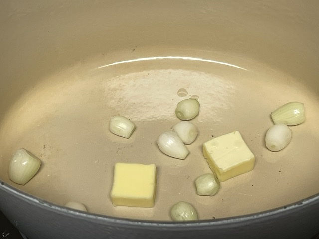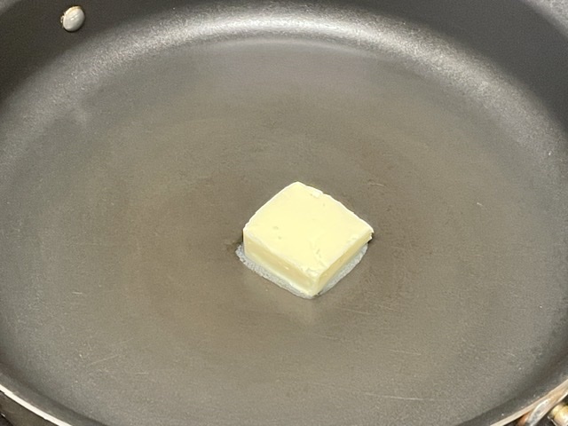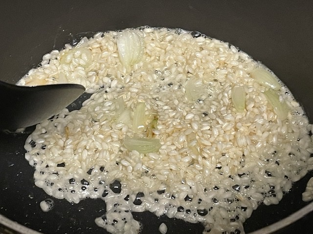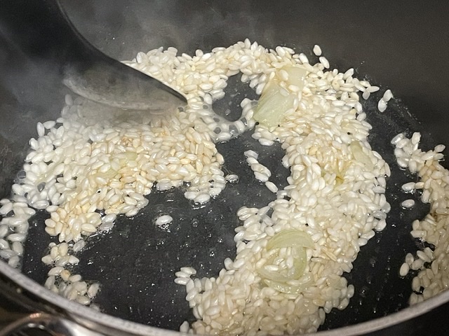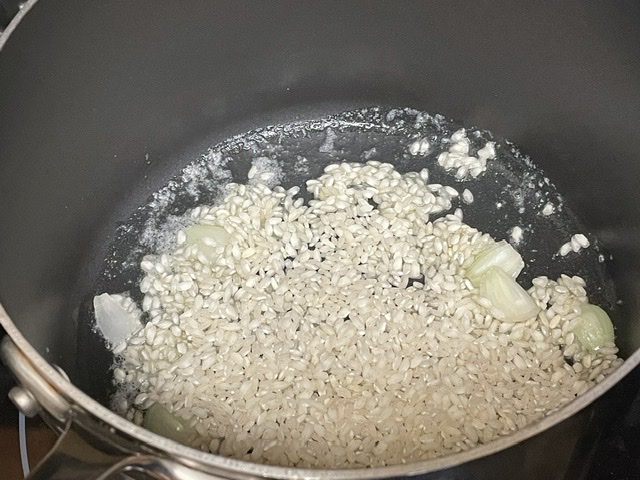 Dans une casserole, faire revenir les oignons ou l’échalote avec la moitié du beurre (14 grammes). Faire cuire pendant 2 minutes sur un feu moyen. Puis ajouter le riz et faire cuire pendant deux minutes plus.