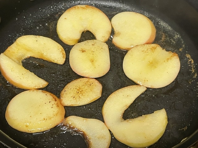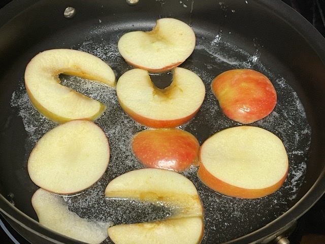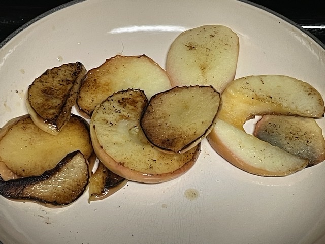 Mettez à chauffer 20 g de beurre dans une poêle. Faites-y revenir les pommes 3 à 4 mn de chaque côté jusqu’à ce qu’elles soient bien colorées et réservez-les au chaud.