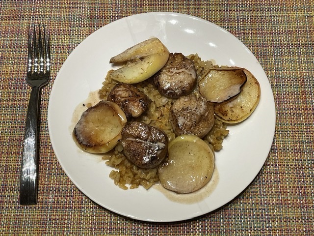 Il y a des fois où je suis un peu trop ambitieux avec mes dîners. ([NON ! Vous PLAISANTEZ ! — Vous tous]) Je suis très content du goût de mon plat principal, mais le repas est trop marron, je le sais. Puisque j’ai décidé de préparer les Saint-Jacques aux pommes, j’ai pensé à ajouter du risotto, au lieu du riz de Camargue. C’est typiquement une bonne combinaison. Mais j’ai suivi une recette qui m’a conseillé d’utiliser du bouillon de bœuf pour faire cuire le riz, et voilà, au lieu d’une jolie couleur jaune, mon risotto est marron. Je suis content des Saint-Jacques eux-mêmes, alors je vais publier la recette, et on parlera du changement nécessaire en bas.