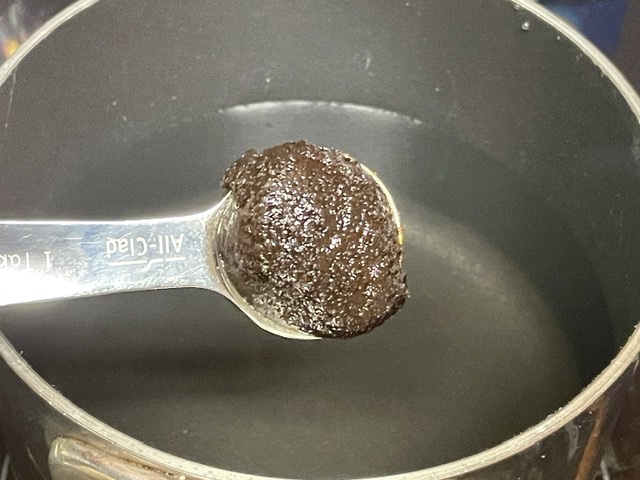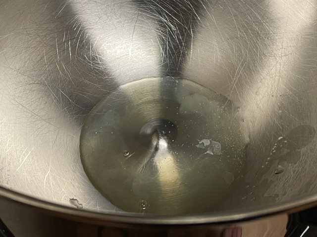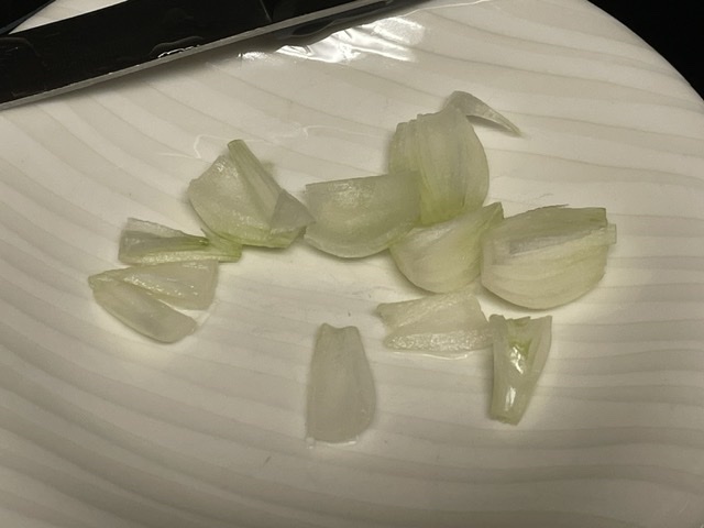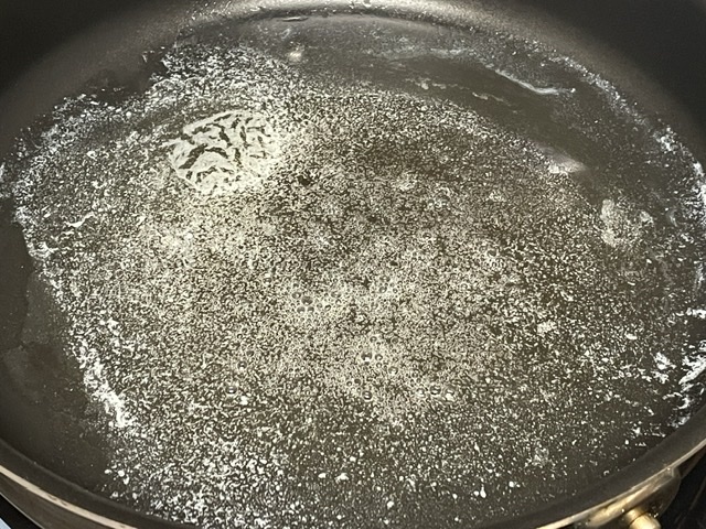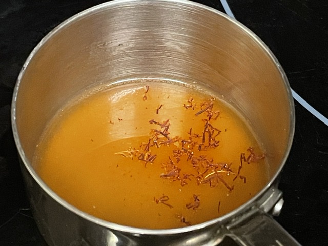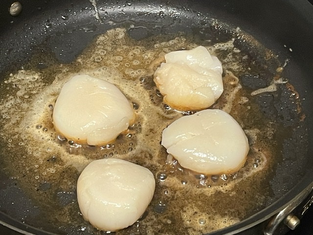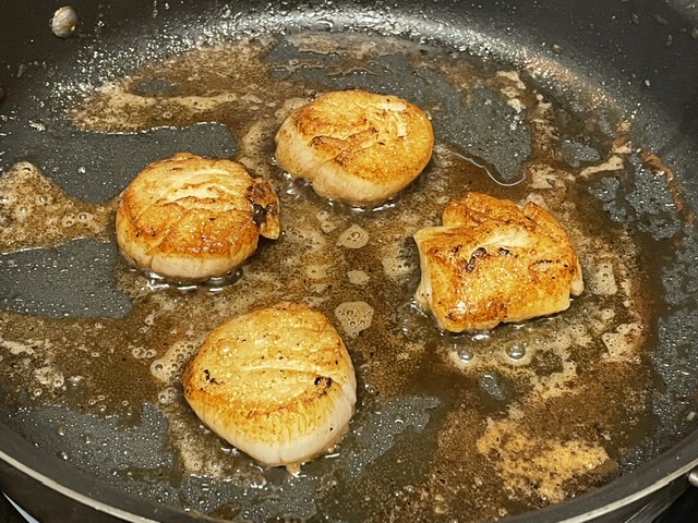 Pour les Saint-Jacques, j’ai coupé la quantité de Saint-Jacques, mais j’ai fait la sauce selon les quantités originales parce que je l’ai trouvé difficile à couper. La sauce n’est pas la partie hyper-chère — par contre, les Saint-Jacques sont maintenant 88 € /kg ici, deux fois leur prix au début du blog. J’ai préparé les deux en même temps — vous comprenez pourquoi je n’allais rien refaire.