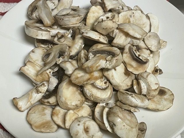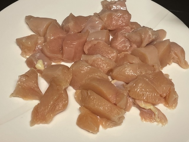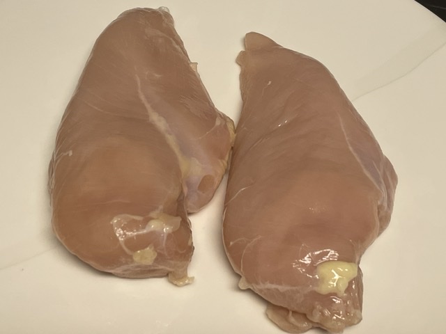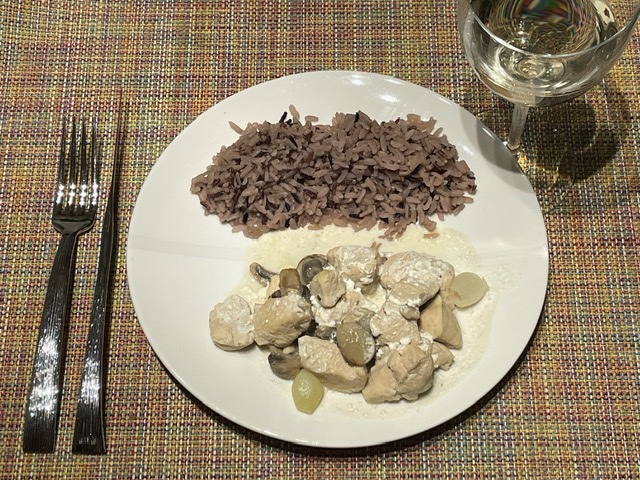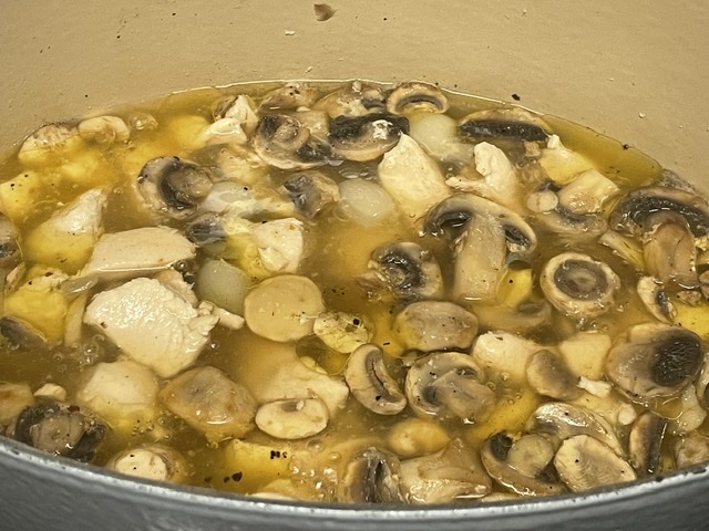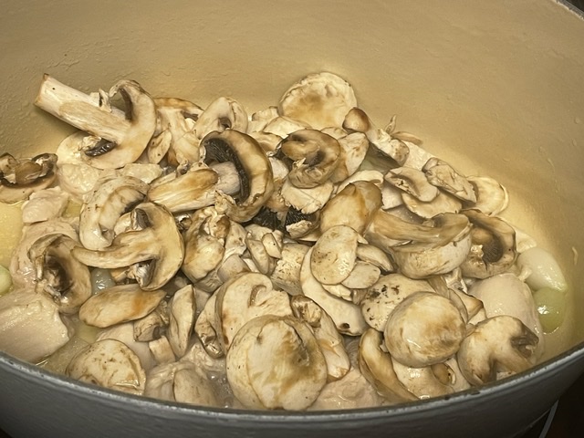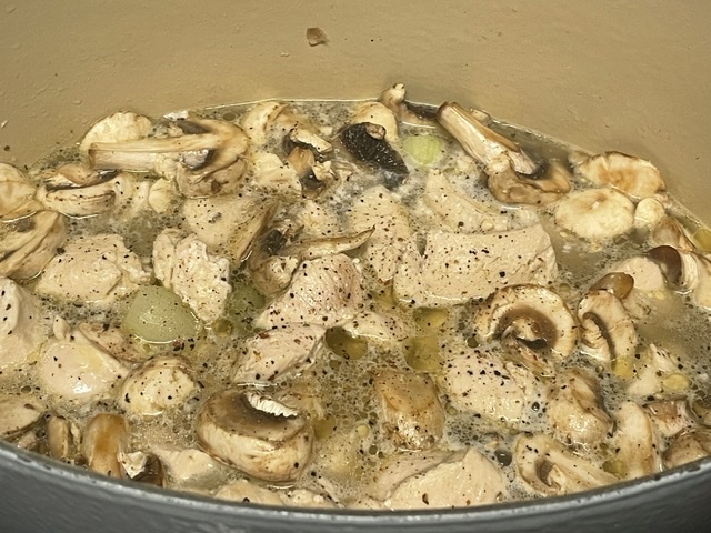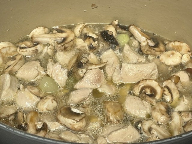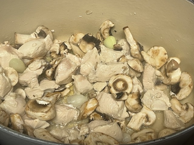 On commence avec notre plat principal, la fricassée de volaille à l’angevine. Je dois notre recette au site Cuisine à la française, mais j’ai utilisé des suprêmes de volaille au lieu d’un poulet entier. J’ai coupé le reste de la recette par deux, comme d’habitude.