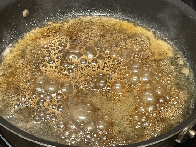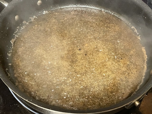 Faire réduire la cuisson de moitié. — Je recommanderais encore plus de réduction. À moitié, j’ai trouvé la sauce toujours pas assez épaisse.