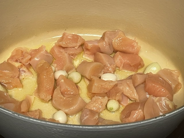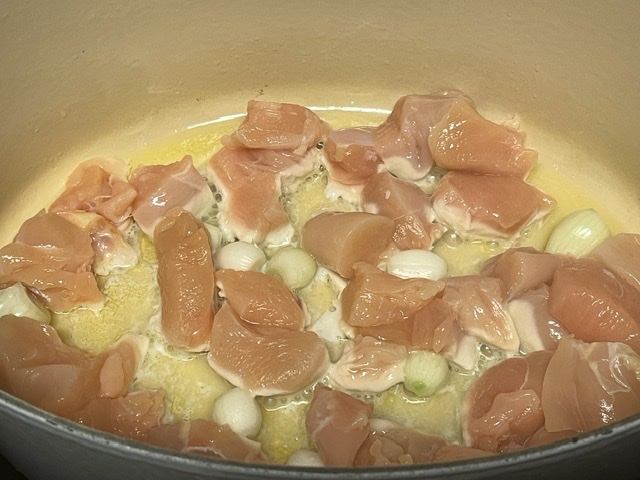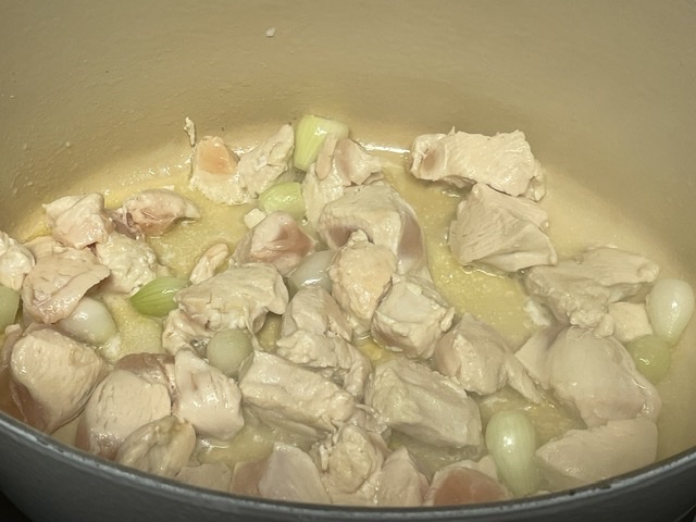 Dans une cocotte faire revenir à feu modéré au beurre le poulet découpé en morceaux avec les petits oignons.