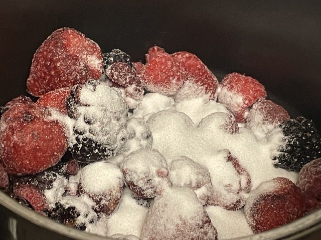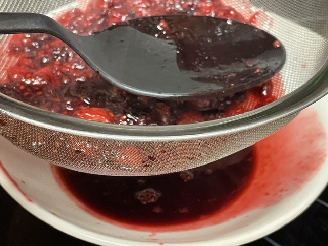 Le coulis de fruits rouges n’est rien de difficile — un sac de fruits rouges surgelés (280 grammes ici), 50 grammes de sucre, un feu vif, un tamis, et hop !