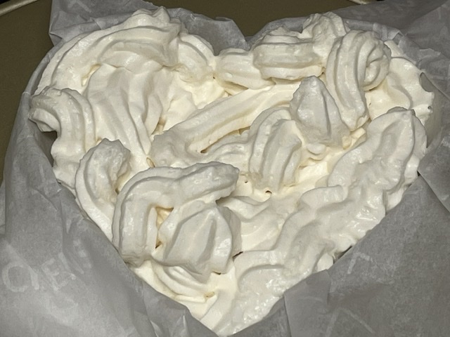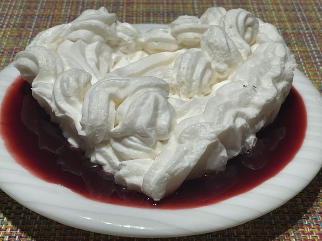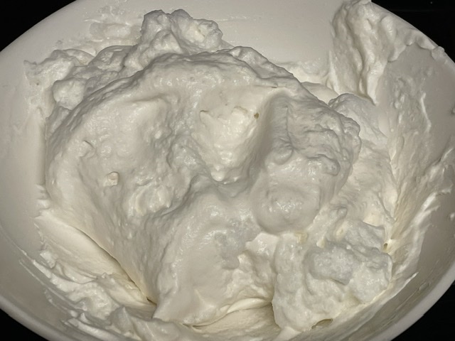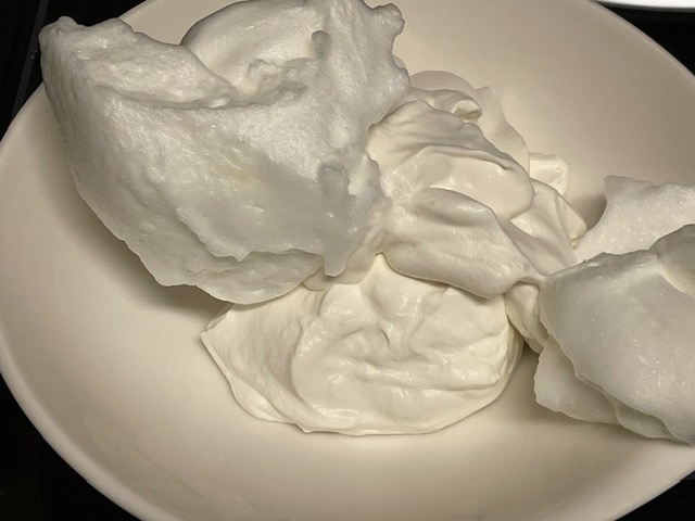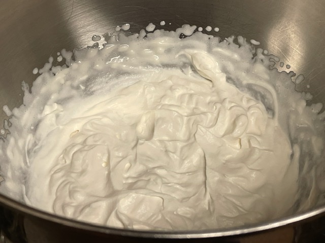 C’est très difficile de faire battre un seul blanc d’œuf dans un robot, alors j’ai utilisé 2, puis je me suis débarrassé de l’excès. (Mes excuses aux poules.) La recette dit de mettre le crêmet au frais après l’avoir mis dans le moule, mais après une heure, je l’ai trouvé beaucoup trop mou. Il allait beaucoup plus mieux au congélateur. Quelques minutes à température ambiante après l’avoir démoulé suffiront. Aussi, j’ai utilisé de la vanille liquide au lieu d’une gousse de vanille, comme d’habitude, car les gousses sont 7-8 $ chacune ici !