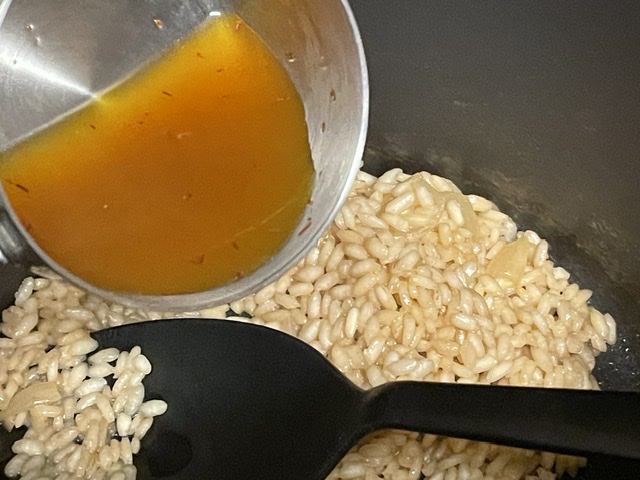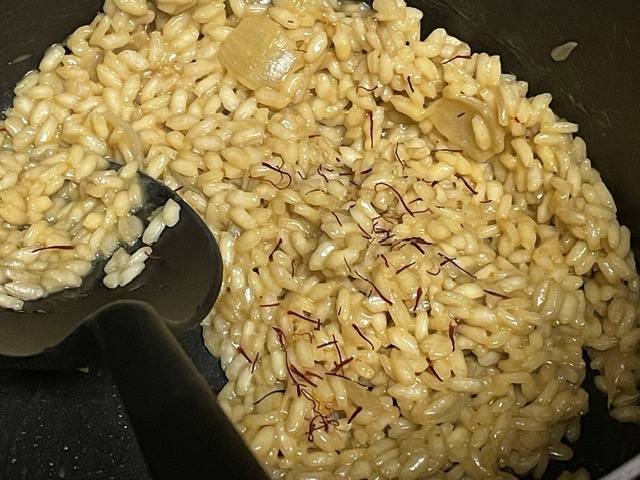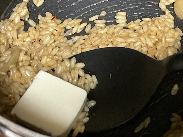 Dès que le riz est cuit, couper le feu et ajouter le safran. Mélanger, puis ajouter le reste du beurre (14 grammes) et mélanger complètement.