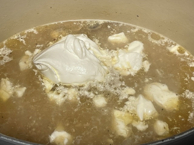 Ajouter la crème fraîche épaisse, laisser bouillir quelques instants. — Comme souvent, j’ai utilisé « sour cream, » pas de la vraie crème fraîche. Ça coûte la moitié du véritable produit. Pour cette recette il vaut mieux d’utiliser la bonne chose.