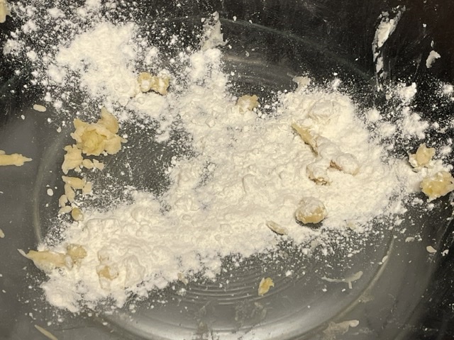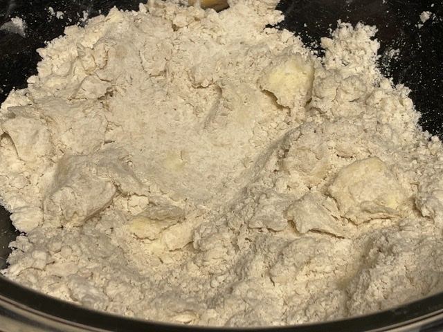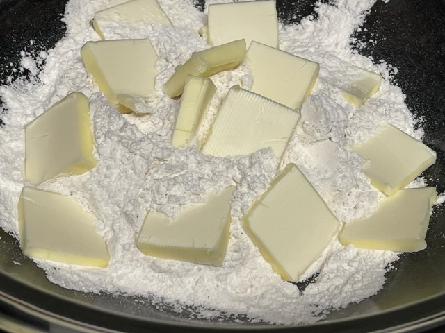 - Dans un saladier, mélanger bien la farine et le beurre. C’est vraiment important que la pâte est bien sablée.