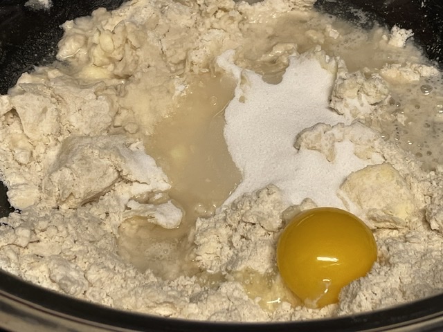 - Ajouter le sel, le sucre, le jaune d’œuf et l’eau. Bien mélanger et ajouter un peu plus de farine si la pâte est trop collante.