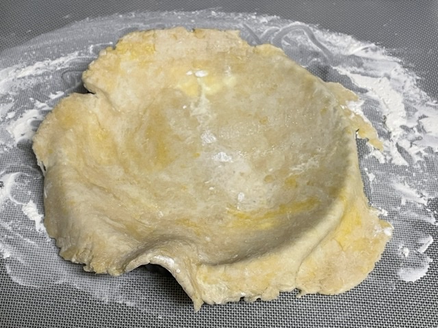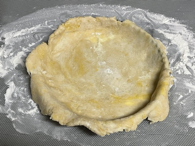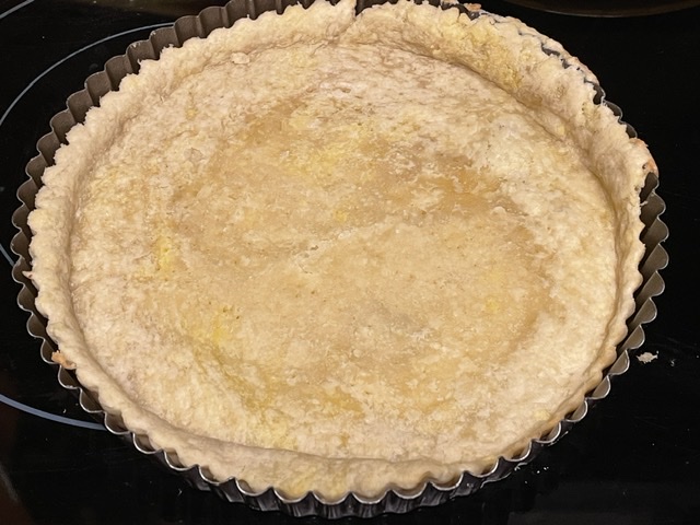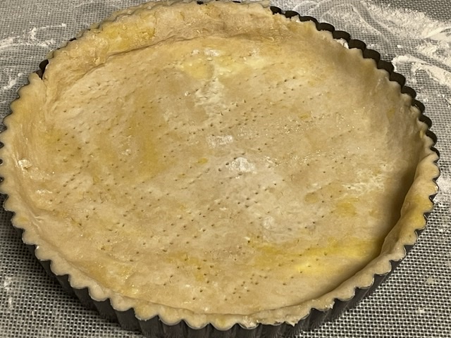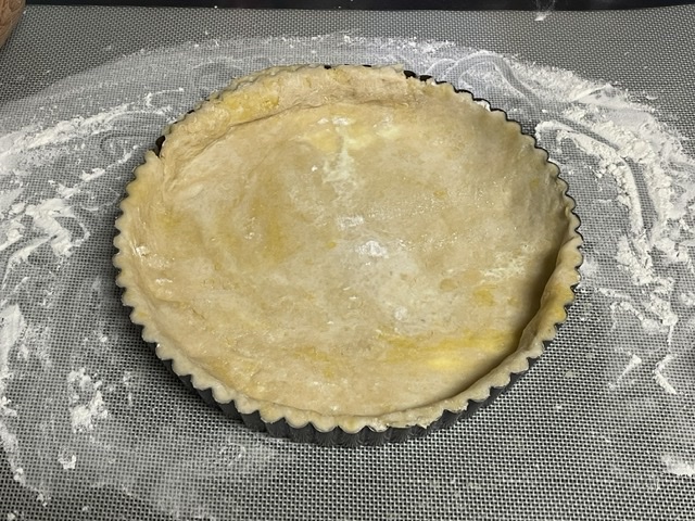 - Beurrer un moule à tarte et garnir avec la pâte. Ce sera plus facile si vous mettez la pâte au-dessus de votre rouleau pour soulever la pâte au-dessus du moule. Puis passer le rouleau par-dessus du moule pour enlever l’excédent de pâte.