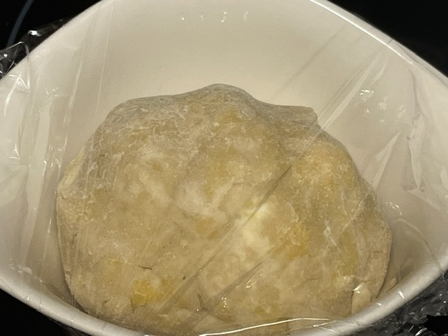- Former une jolie boule, mettre dans un bol propre, couvrir avec du film à contact, piquer le film avec une fourchette, et réserver au frigo pendant au moins une heure. Moi, j’aime mettre un peu de farine dans le saladier pour y rouler la boule avant de la mettre au frigo. La pâte ne sera jamais collante.