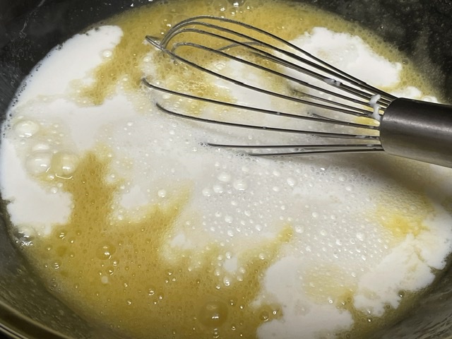 1. Ajouter un peu du lait chaud aux œufs et mélanger.