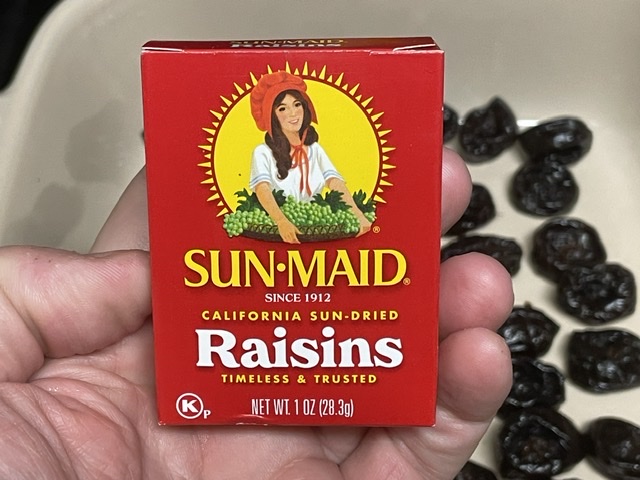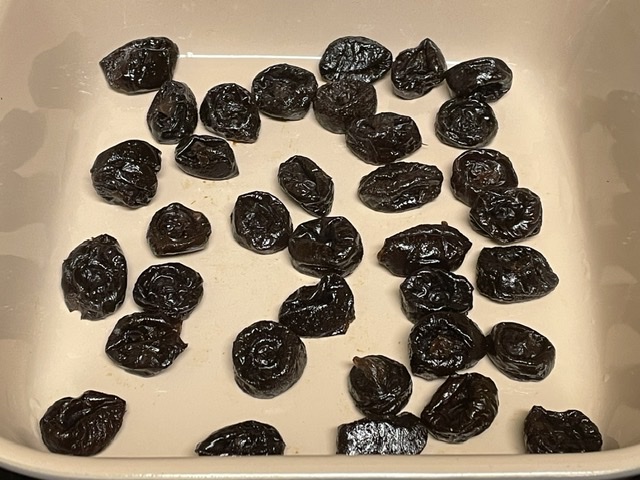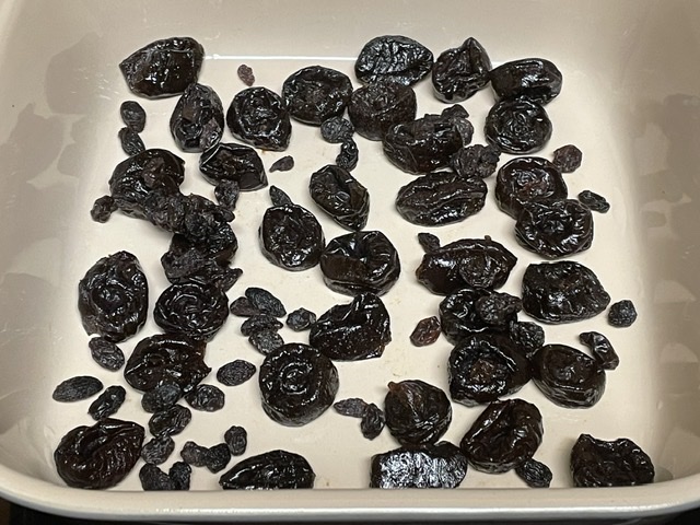 2. Mettre les pruneaux et raisins secs au fond d’un plat rectangulaire.