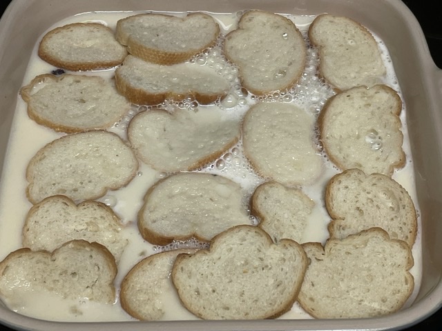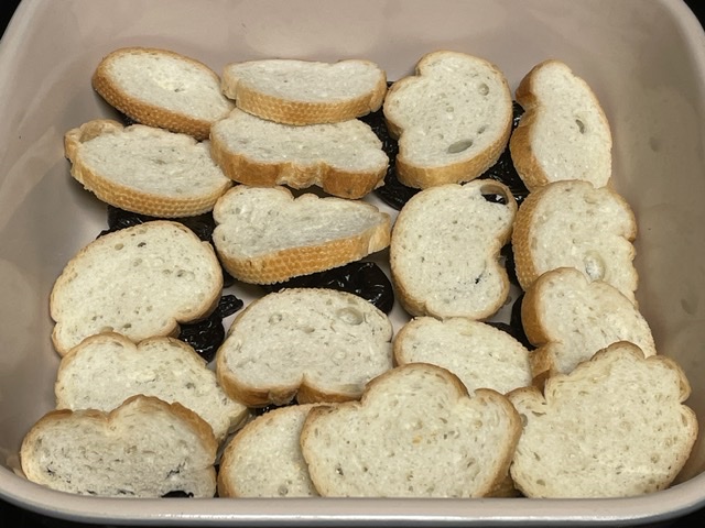 C’est censé être une recette anti-gaspi, mais je viens de la mauvaise place pour acheter une baguette quotidienne — j’ai donc payé cher (prononcé « 4 € ») juste pour trouver le bon genre de baguette. (Celles disponibles près de chez moi sont soit nulles soit du levain.) Alors, avant de commencer, j’ai dû sécher ma baguette au four, comme ça :