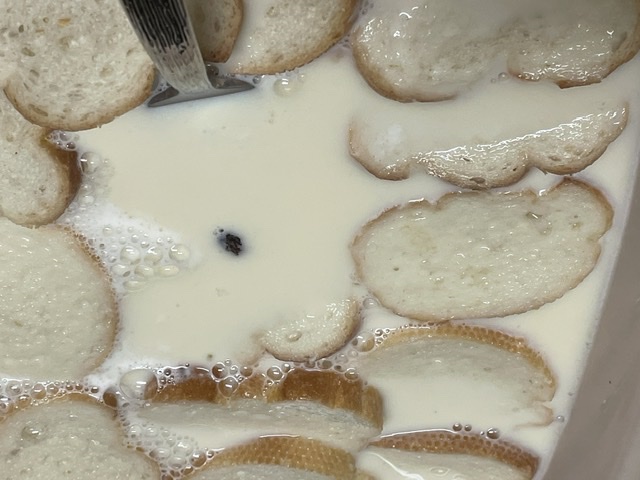 1. Avec une fourchette, faire tremper le pain dans le lait.