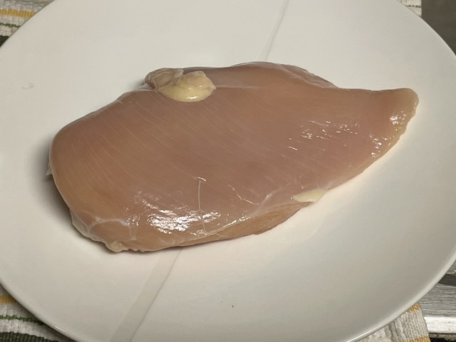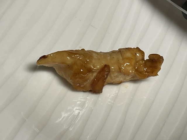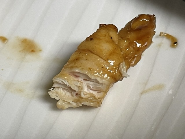Comme Chef Dumas, je fais une contrôle de qualité et coupe un morceau en deux pour me rassurer que le poulet est assez cuit. Voilà :