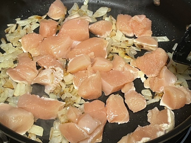 Dans une poêle, faîtes revenir les oignons dans une cuillère à soupe d’huile d’olive puis mettre les morceaux de poulet.