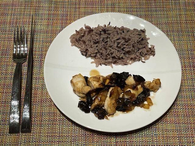 J’ai dû chercher la bonne recette pour ce soir, car je n’allais pas chercher du lapin ou du foie gras, et ce sont les spécialités locales du Lot-et-Garonne. Mais j’ai enfin trouvé cette recette de poulet aux pruneaux d’Agen et au miel d’acacia qui met en vedette trois produits locaux du Lot-et-Garonne (le poulet, les pruneaux, et le miel). Vous pouvez trouver des pruneaux d’Agen chez Carrefour ; le reste, c’est à vous.
